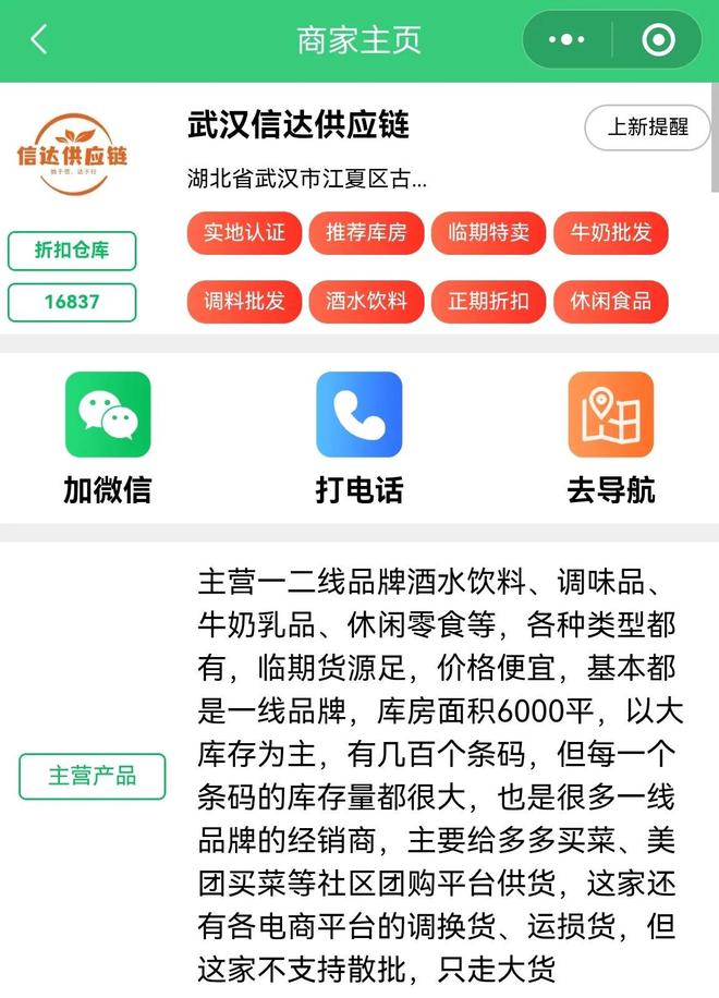 武汉信达供应链,在淘货王的库房编码是16837,位于湖北省武汉市江夏区,主营酒水饮料、卫生纸纸巾、米面粮油、日化用品、休闲食品等,基本覆盖全品类快消品,大多都是一线多平,主要以大库存为主,有几百个条码,但每一个条码的库存量都很大,也是很多一线品牌的经销商,主要给多多买菜、美团买菜等社区团购平台供货;关键是这家还会时不时有各电商平台的的退换货和运损货源。