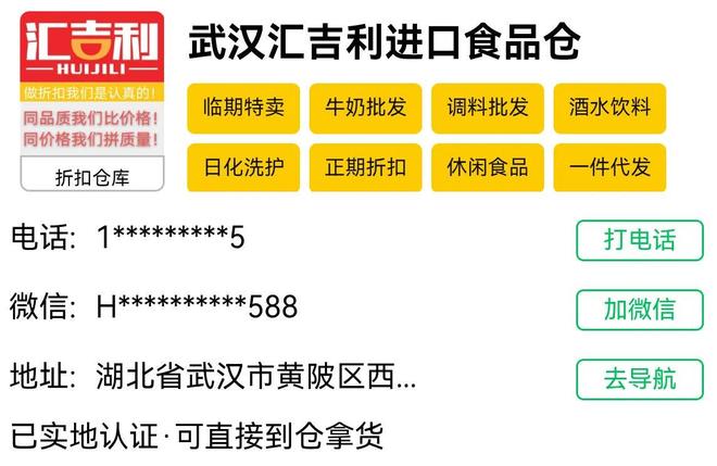武汉汇吉利进口食品仓,在淘货王库房编码是48524,位于湖北省武汉市黄陂区,这家主营休闲食品、零食、日化用品、酒水饮料等,发货方式可以到仓库自提,武汉本市市区可以免费配送,外地用户免费配送到物流园,最关键的是这家可以做一件代发,很多商超、二批、部队、学校、夫妻店都在他们家拿货,基本上都是一线品牌,如乐虎、红牛、银鹭、亲亲系列、香飘飘等全都有,总共有1000多个条码,支持全国发货哈。